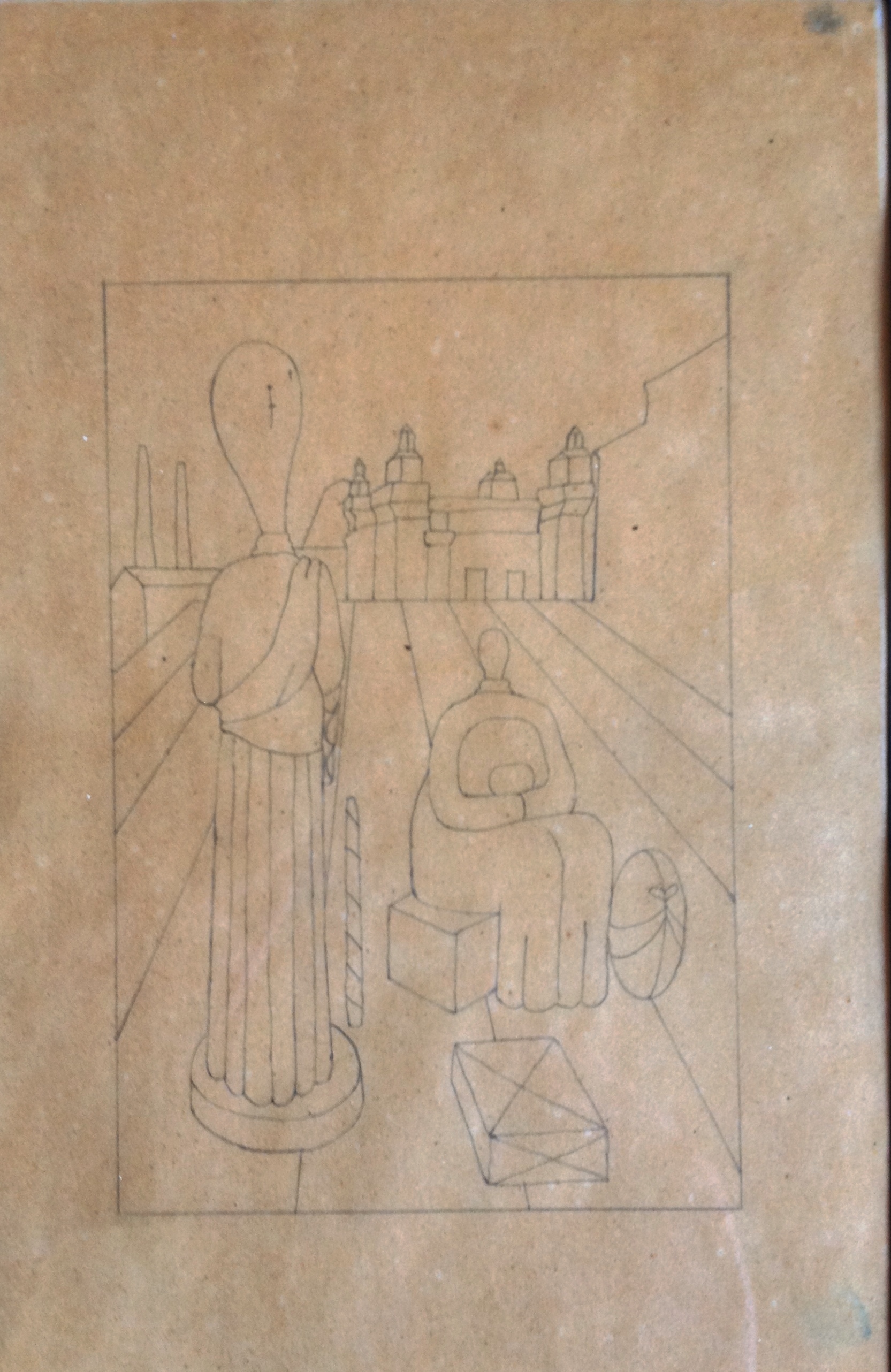 Analizzando bene il bozzetto, ho scoperto che, rispetto all’originale (ora visitabile nella mostra “Giorgio de Chirico. Metafisica e Avanguardie”), non vi sono presenti la statua-manichino e la scatola “esoterica” nella parte destra in ombra.