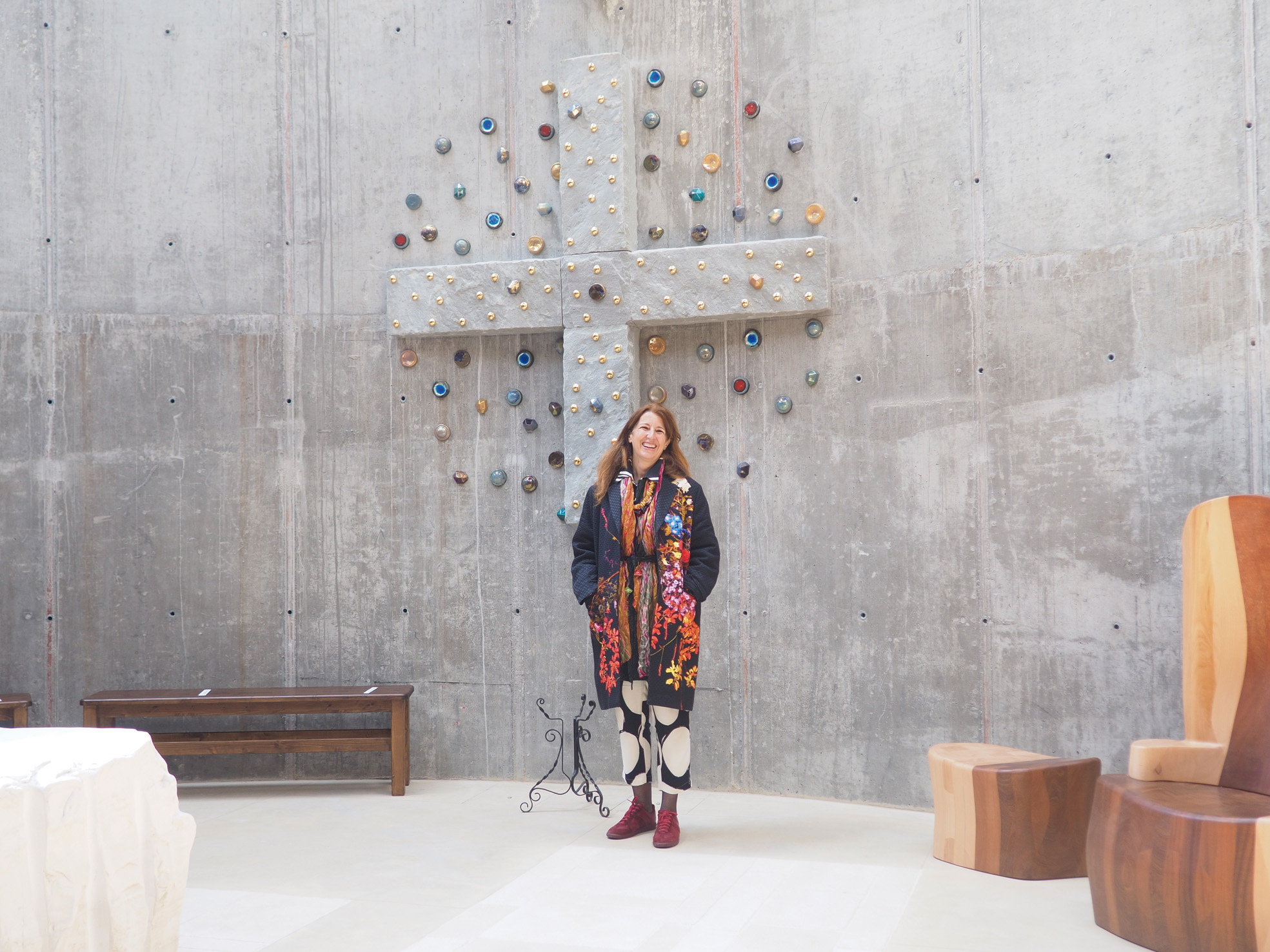 Nessun richiamo al passato, dunque, viene da pensare. Ma non è del tutto così. La Madonna “nera” proviene dalla chiesa delle Stimmate di via Palestro, e le due grandi travi a forma di croce che sovrastano i fedeli nell’ambiente centrale, sono state ricavate dal legno proveniente da un vecchio ambiente del Municipio cittadino. In particolare, è stato don Stefano Zanella a scegliere la statua mariana, rimanendone subito folgorato. «Mi ricorda – prosegue Tagliabue – la Moreneta, la Madonna nera nel Monastero benedettino di Montserrat» in Catalogna. E il “nero” della Vergine Maria, vigile di fianco all’altare, richiama anche le cromie dei “fazzoletti” che Cucchi ha “posato” sulle grandi croce adornanti alcune pareti, così diverse dalla magnetica croce gemmata nel presbiterio.