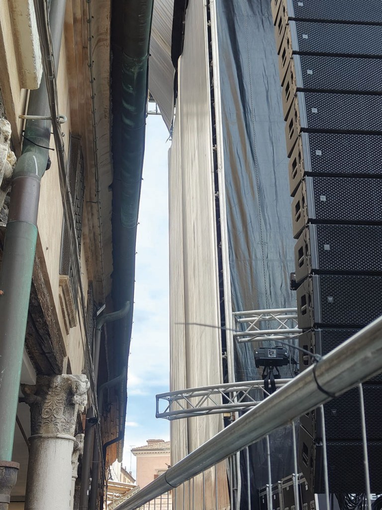 È venerdì mattina, ma la normale vita fatta del mercato, della gente che si incontra, dell’attesa del meritato riposo settimanale, è stravolta da un via vai di furgoni e di tir. Sì, tir, che transitano da corso Martiri fino al Listone. E una decina sono le auto comodamente parcheggiate su p.zza Trento e Trieste, di fronte al palco. Qualcuno si chiede perché il mercato settimanale – secondo le dichiarazioni dell’Assessora Travagli – “disturberebbe” i diversi cantieri in centro, mentre un mediamostro (un mostro mediatico) come questo, no. Dicevamo dei camion: alcuni bilici (o autoarticolati) che per raggiungere quello che sarà il backstage (tra il palco e Palazzo San Crispino) passano nell’esile spazio rimasto tra il palco e il lato dell’ex chiesa di san Romano. C’è solo un “gorilla” della Securfox a fermare i pedoni increduli e a far passare l’enorme mezzo.