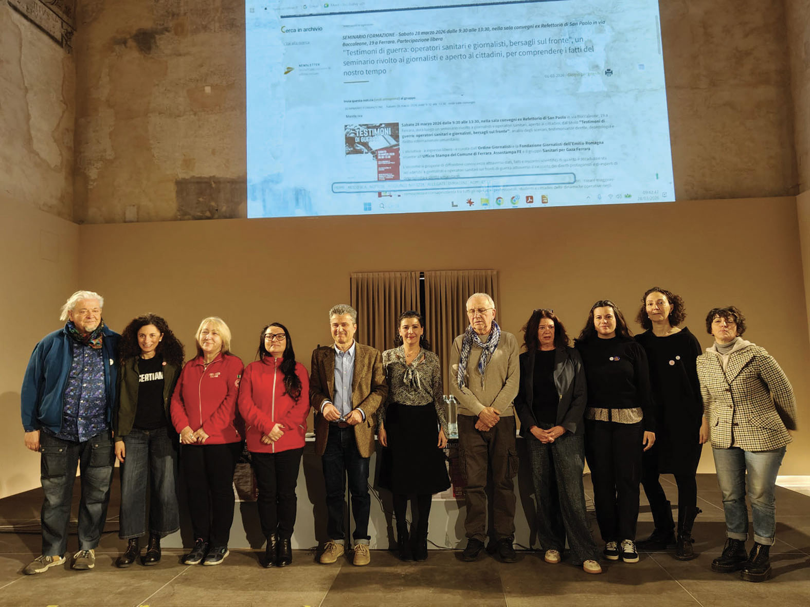 L’orrore della guerra, di ogni guerra, anche oggi, è stato il tema del seminario svoltosi la mattina dello scorso 28 marzo nella Sala ex Refettorio di San Paolo a Ferrara. Il Seminario dal titolo “Testimoni di guerra: operatori sanitari e giornalisti, bersagli sul fronte” è stato organizzato da Ordine Giornalisti e Fondazione Giornalisti Emilia-Romagna insieme a Ufficio Stampa del Comune di Ferrara, Assostampa FE e “Sanitari per Gaza – Ferrara”. Tanti i presenti. Dopo il saluto di Antonella Vicenzi di Assostampa Ferrara, ha introdotto il moderatore della mattinata Alessandro Zangara, giornalista, capo Ufficio Stampa Comune di Ferrara: «oggi – ha detto – nel mondo vi sono 55 fronti globali di varia intensità». Sono 541 i giornalisti uccisi dal 2020 al 2026 su fronti di guerra; e sono numeri in continuo aumento, con 124 giornalisti uccisi nel 2024 e 127 nel 2025. Attualmente sono stimati fra i 500 e i 700 i giornalisti detenuti nel mondo. Sono invece oltre 850mila i civili uccisi nelle guerre dal 2020 al 2026 e 3283 gli operatori sanitari uccisi sui fronti nello stesso periodo, anche in questo caso in aumento (900 nel 2024 e 1100 nel 2025).