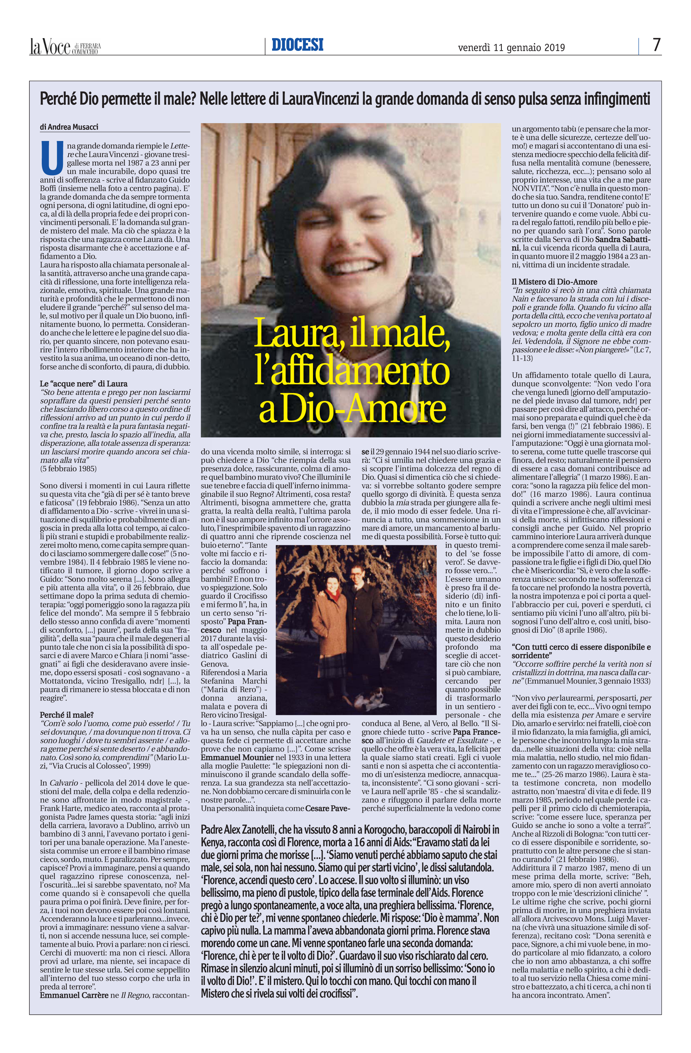 Una grande domanda riempie le “Lettere” che Laura Vincenzi – giovane tresigallese morta nel 1987 a 23 anni per un male incurabile, dopo quasi tre anni di sofferenza – scrive al fidanzato Guido Boffi. E’ la grande domanda che da sempre tormenta ogni persona, di ogni latitudine, di ogni epoca, al di là della propria fede e dei propri convincimenti personali. E’ la domanda sul grande mistero del male. Ma ciò che spiazza è la risposta che una ragazza come Laura dà. Una risposta disarmante che è accettazione e affidamento a Dio.